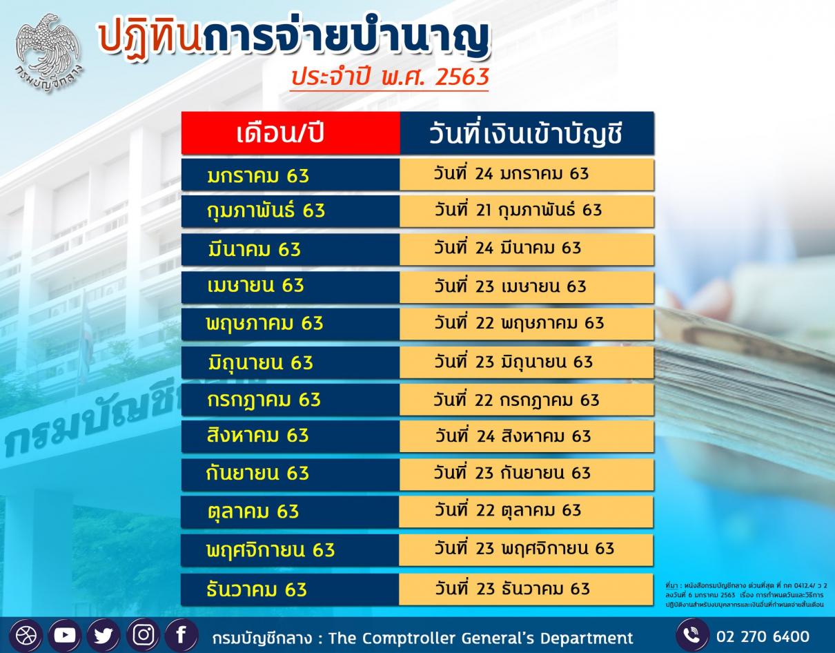 นางสาวิลาวรรณ พยาน้อย รองอธิบดีกรมบัญชีกลาง ในฐานะโฆษกกรมบัญชีกลาง เปิดเผยว่า ตามมติที่ประชุมคณะรัฐมนตรี (ครม.) เมื่อวันที่ 30 มิถุนายน 2563 ได้พิจารณาเกี่ยวกับเรื่อง การกำหนดวันหยุดราชการเพื่อชดเชยวันหยุดในช่วงเทศกาลสงกรานต์ ประจำปี พ.ศ. 2563 โดยกำหนดให้วันจันทร์ที่ 27 กรกฎาคม 2563 เป็นวันหยุดราชการเพื่อชดเชยวันหยุดในช่วงเทศกาลสงกรานต์ ประจำปี พ.ศ. 2563 จำนวน 1 วัน กรมบัญชีกลางได้ปรับการจ่ายเงินในเดือนกรกฎาคม 2563 ให้เร็วขึ้น จากเดิมการจ่ายเงินเดือนข้าราชการและลูกจ้างประจำ กำหนดจ่ายในวันที่ 27 กรกฎาคม 2563 เปลี่ยนเป็นวันที่ 24 กรกฎาคม 2563 ส่วนการจ่ายเงินสำหรับผู้รับบำนาญ จากเดิมกำหนดจ่ายในวันที่ 24 กรกฎาคม 2563 เปลี่ยนเป็นวันที่ 22 กรกฎาคม 2563 ซึ่งเป็นไปตามระเบียบและวิธีปฏิบัติในการจ่ายเงินเดือน ที่กำหนดให้จ่ายก่อน 3 วันทำการสุดท้ายของเดือน และการจ่ายเงินบำนาญที่กำหนดให้จ่ายก่อน 5 วันทำการสุดท้ายของเดือน สำหรับการจ่ายเงินเดือนข้าราชการ ลูกจ้างประจำและผู้รับบำนาญในเดือนถัดไปจะยังคงกำหนดจ่ายตามปฏิทินการจ่ายเดิม ดังนี้