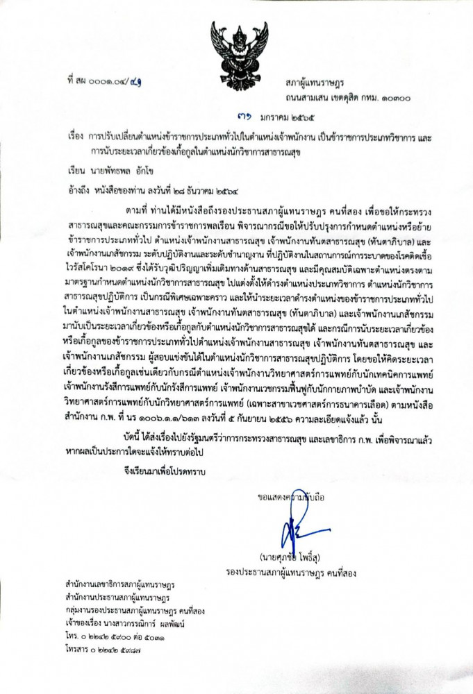 เมื่อวันที่ 31 มกราคม 2565 สำนักงานประธานสภาผู้แทนราษฎร กลุ่มงานรองประธานสภาผู้แทนราษฎร คนที่สอง มีหนังสือแจ้งว่า ได้ส่งเรื่องไปยังรัฐมนตรีว่าการกระทรวงสาธารณสุข และเลขาธิการ ก.พ. เพื่อพิจารณาต่อไป