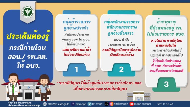 กระทรวงสาธารณสุข เผย ถ่ายโอน รพ.สต.เพิ่มที่ “ขอนแก่น” รวมเป็น 9 จังหวัด 825 แห่ง ข้าราชการ/ลูกจ้างประจำช่วงเปลี่ยนผ่าน อาจได้เงินเดือนช้ากว่าปกติ ห่วงกลุ่มพนักงานราชการ/พกส./ลูกจ้างชั่วคราว อบจ.ยังทำแนวทางการจ้างไม่เสร็จ อาจทำให้มีปัญหาการจ่ายเงินเดือน ให้สำนักงานสาธารณสุขจังหวัดเร่งประสานติดตาม เพื่อไม่ให้ลูกจ้างได้รับผลกระทบ