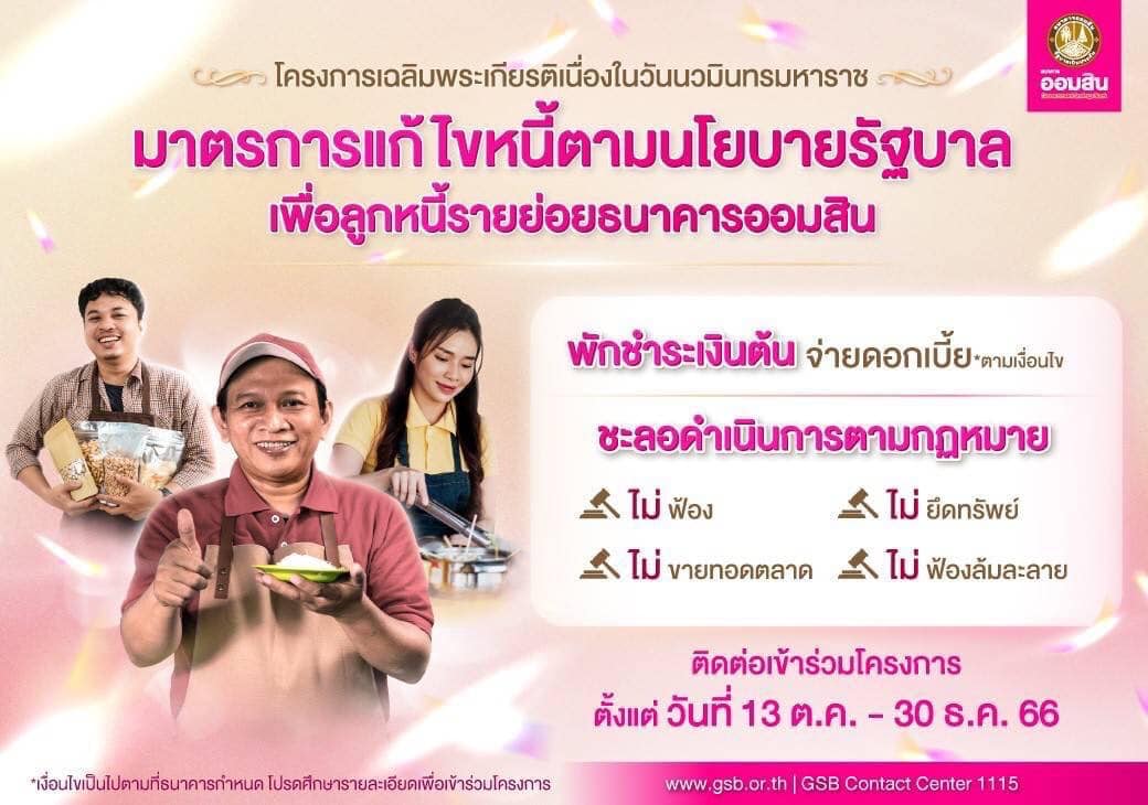 ธนาคารออมสิน ขานรับนโยบายตามที่รัฐบาลมอบหมายให้ทุกภาคส่วนเร่งช่วยเหลือแก้ปัญหาหนี้ภาคประชาชน ธนาคารจึงได้จัดโครงการเฉลิมพระเกียรติเนื่องในวันนวมินทรมหาราช วันที่ 13 ตุลาคม 2566 โดยออกมาตรการให้ความช่วยเหลือลูกหนี้ที่ได้รับผลกระทบทางเศรษฐกิจต่อเนื่องจากการแพร่ระบาดของโควิด-19 ที่ประสบปัญหาการผ่อนชำระ และลูกหนี้บางส่วนที่มีสถานะ NPLs จากผลกระทบดังกล่าว โดยจะเปิดให้เข้าร่วมโครงการได้จนถึงวันที่ 30 ธันวาคม 2566